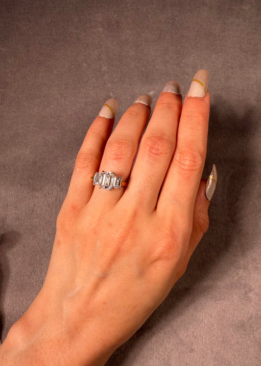 Lab Grown 2.50 Carat Emerald Cut Diamond Trilogy Ring, 18K Yellow Gold