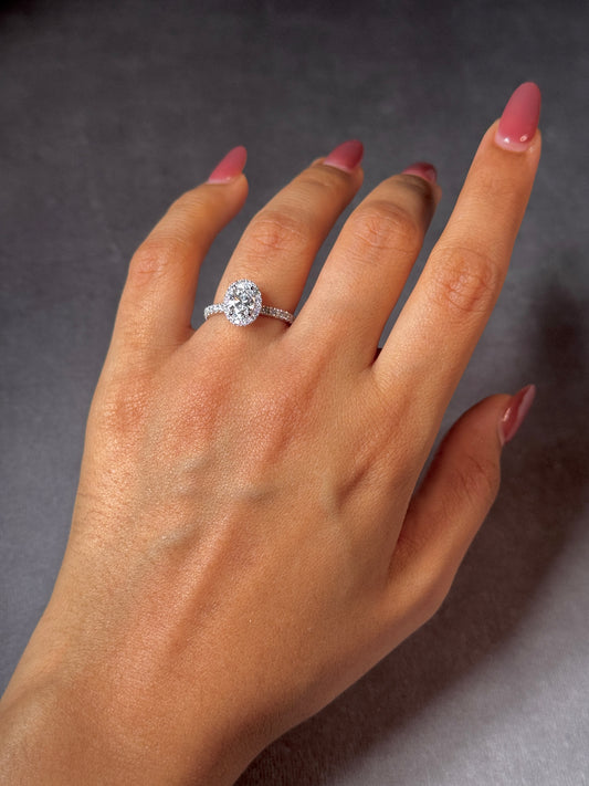 Lab Grown Oval Halo Diamond Ring in 18 Carat White Gold, T=1.43ct.