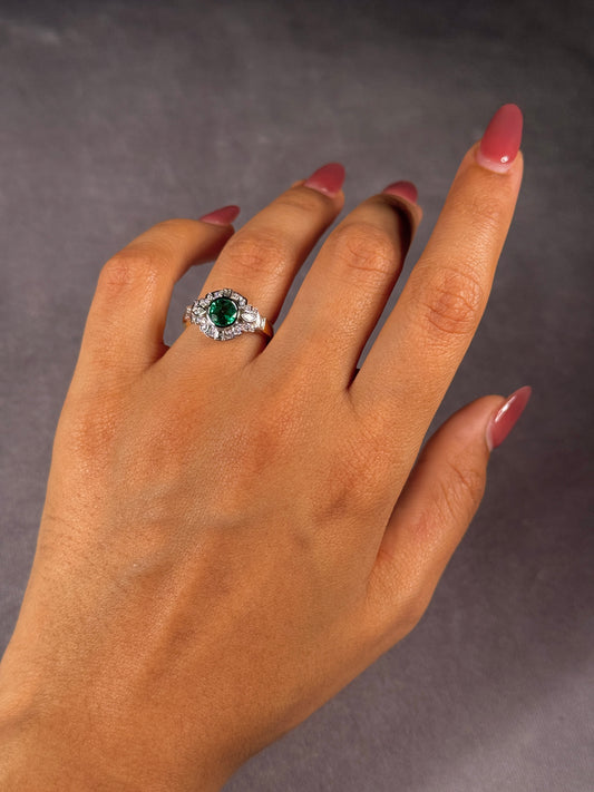 Natural Emerald & Diamond Bezel Set Ring in 18K White and Yellow Gold.